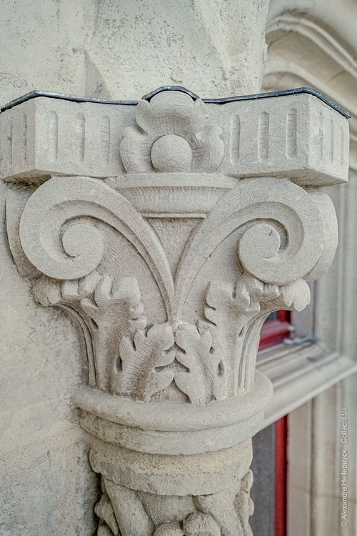 Surtout, il orne la façade d'un foisonnant décor inspiré du répertoire gothique de la fin du Moyen Age : accolades, gâbles, pinacles, fleurons, choux et pampres, remplages ajourés. Les chapiteaux et culots s'ornent de fleurettes, rosaces, figurines, saynètes où se glissent de facétieux personnages inspirés de l'imagerie médiévale, principalement des singes, des chouettes et des dragons.